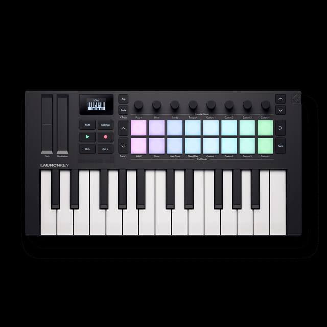 Launchkey Mini 25は、シリーズ最もコンパクトなモデルでありながら、クリエイティブな機能を多数搭載する強力なMIDIキーボードです。シンセスタイルのミニ鍵盤、ポリフォニック・アフタータッチ対応の16個のパッド、そして直感的にDAWと統合できるコントロールサーフェスなど、すべてが創造性を高めるために設計されています。