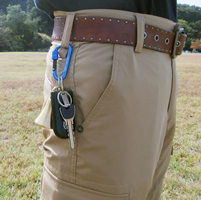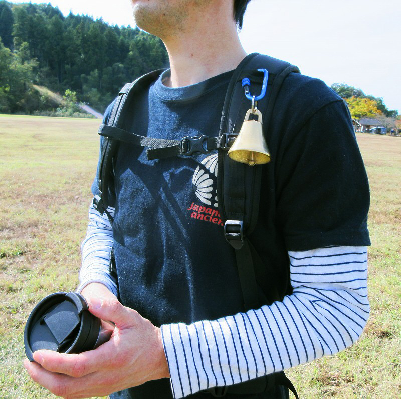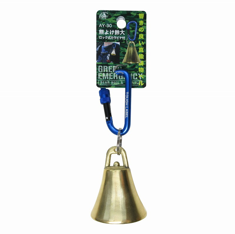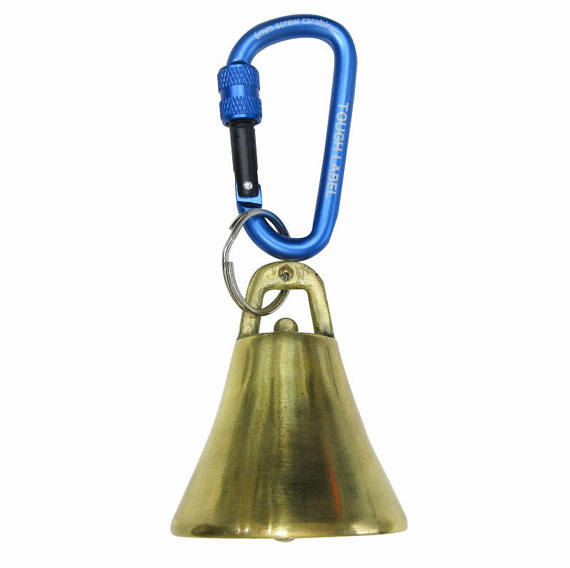 大型真鍮製熊よけ鈴に紛失しにくいロック式カラビナ付。