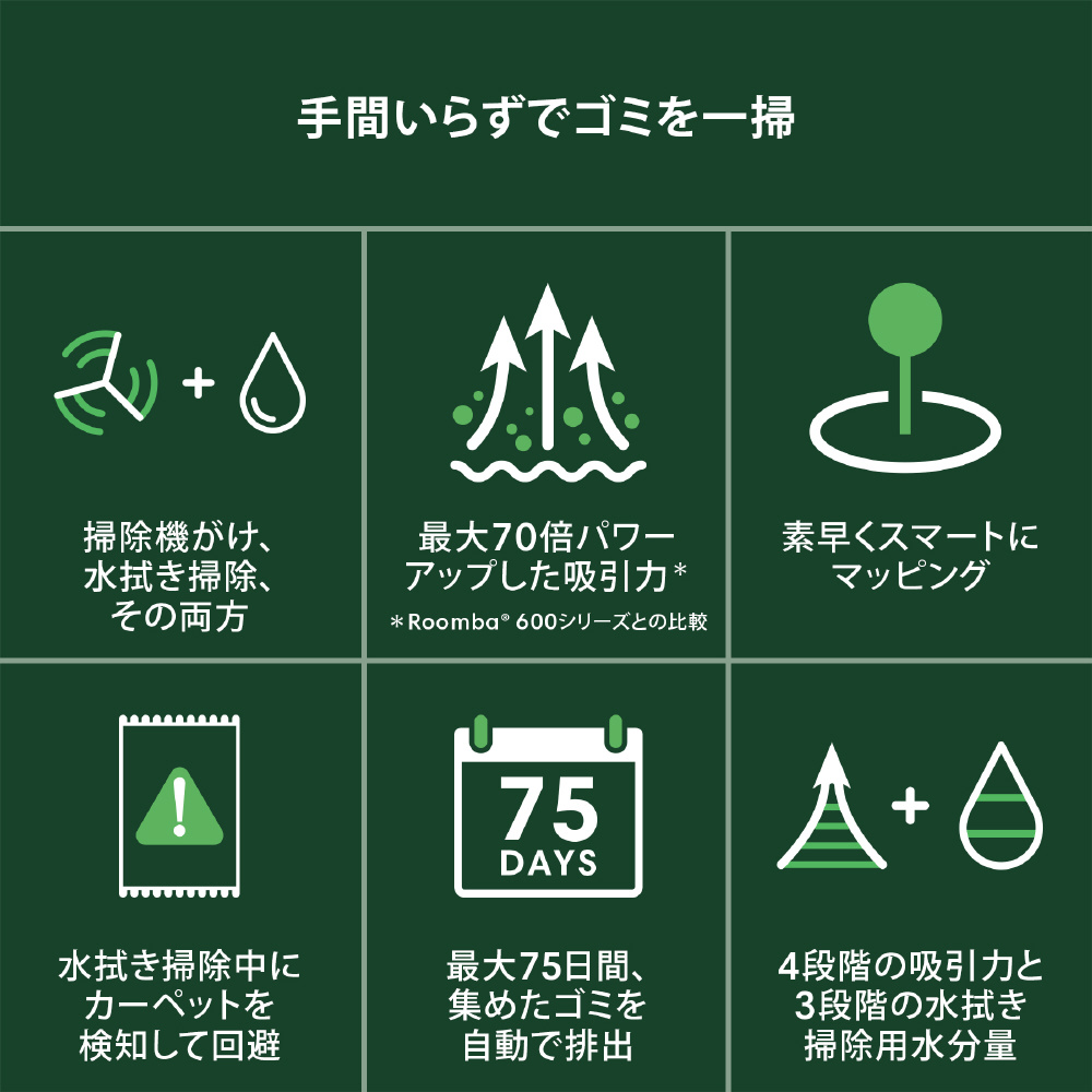 パワーアップした吸引力と、賢くなったナビゲーションで部屋の隅々までしっかり掃除機がけ、水拭きを行います。更にゴミを取り込んで最大75日間収納します。