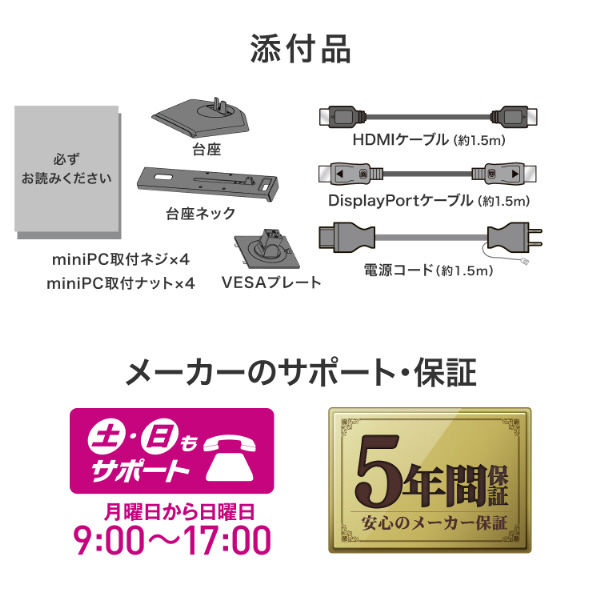 | 付属品 | 電源コード(PSE適合品、約1.5m)、HDMIケーブル(約1.5m)、DisplayPortケーブル(約1.5m)、必ずお読みください、台座、台座ネック、ケーブルフック |
