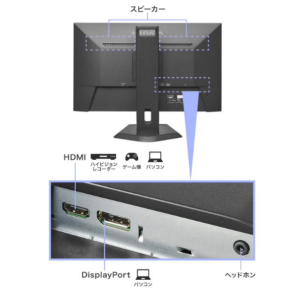 「DisplayPort」「HDMI」の入力端子を搭載し、ケーブルも標準添付しているので、さまざまな機器と接続して使用できます。