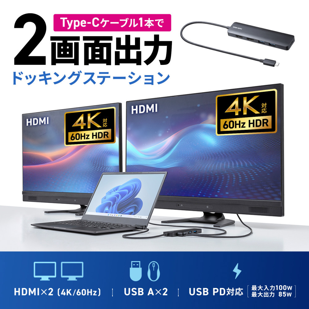 映像変換アダプタ [USB-C オス→メス HDMIx2 /USB-Ax2+USB-Cメス給電 /USB Power Delivery対応 /100W] 4K対応 USB-5TCHHPS22BK