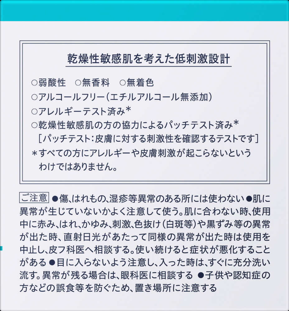 | 仕様3 | ■香り・色・味 ○弱酸性 ○無香料 ○無着色 ○アルコールフリー(エチルアルコール無添加) ○アレルギーテスト済み* ○乾燥性敏感肌の方の協力によるパッチテスト済み* [パッチテスト:皮膚に対する刺激性を確認するテストです] *すべての方にアレルギーや皮膚刺激が起こらないというわけではありません |