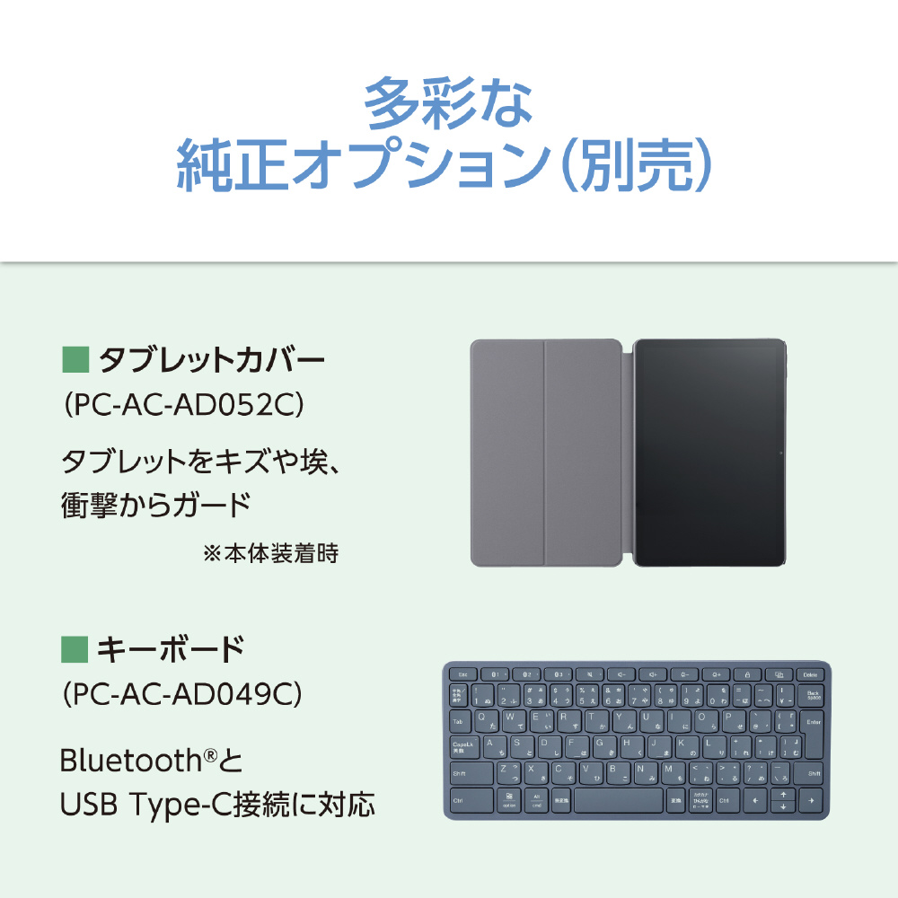 本体を保護し、使用時はスタンドとしても使える「タブレットカバー」や、快適に文字入力できる「キーボード」をご用意。