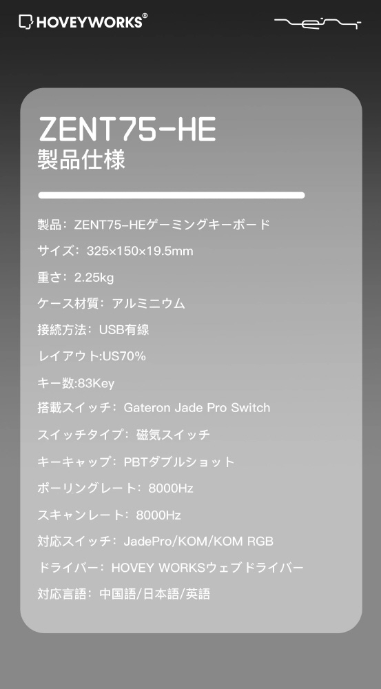 | 商品名 | ゲーミングキーボード(ラピッドトリガー対応) ZENT75-HE(英語配列) ホワイト HW-ZENT75WHITE [有線 /USB] 【sof001】 |