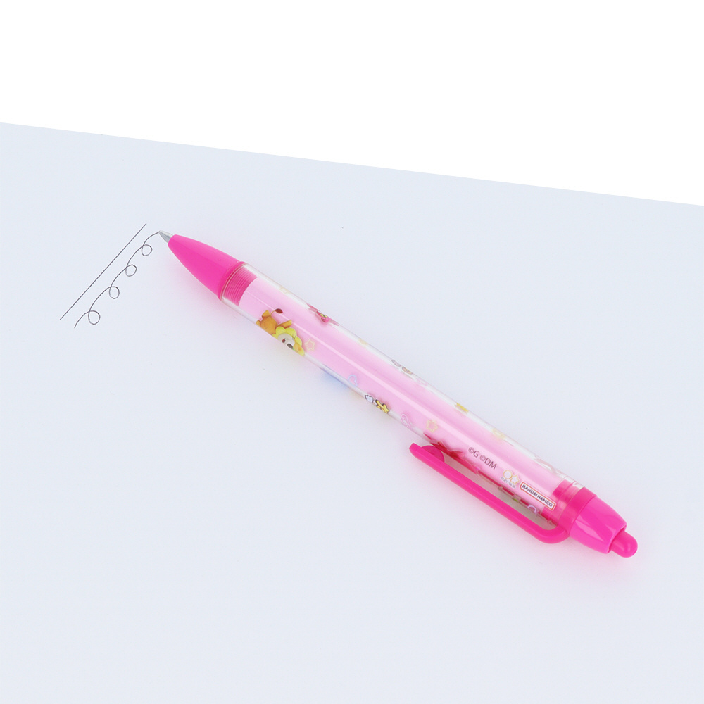 シンプルな油性の黒インクボールペンです。クリア素材のボディにキャラクターデザインの軸をセットした二層構造で、立体感がさりげなく可愛いアイテムです。ノートに挟めるクリップ付き。