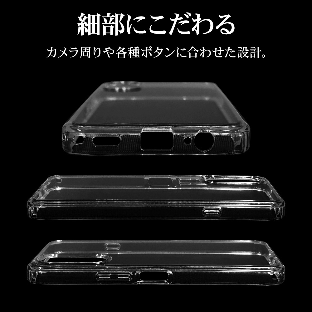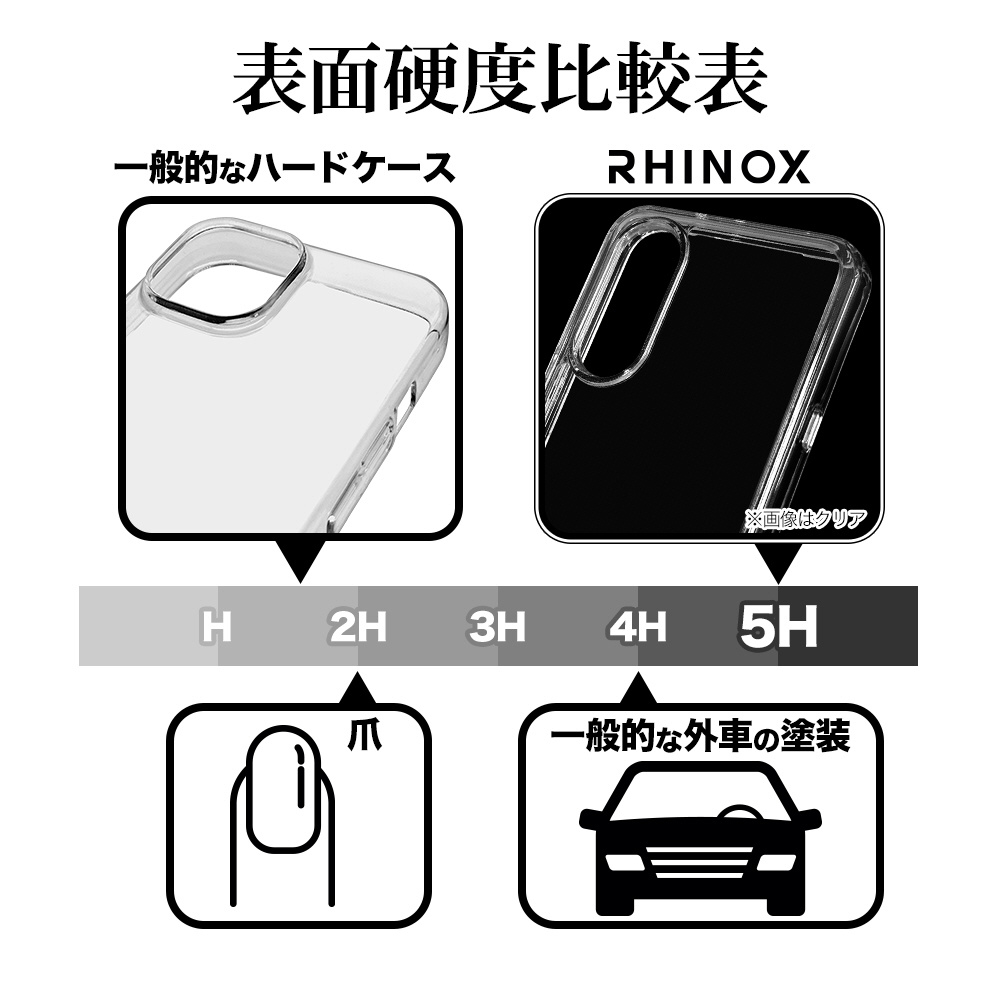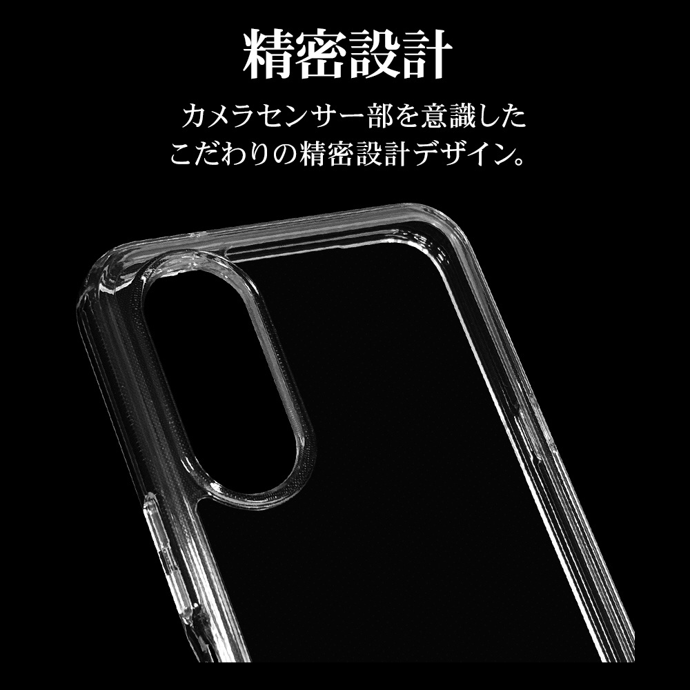 ●側面は弾力と柔軟性を兼ね備えたTPU素材で端末を衝撃から保護。背面は表面硬度5Hの傷に強いアクリル素材を使用しています。
