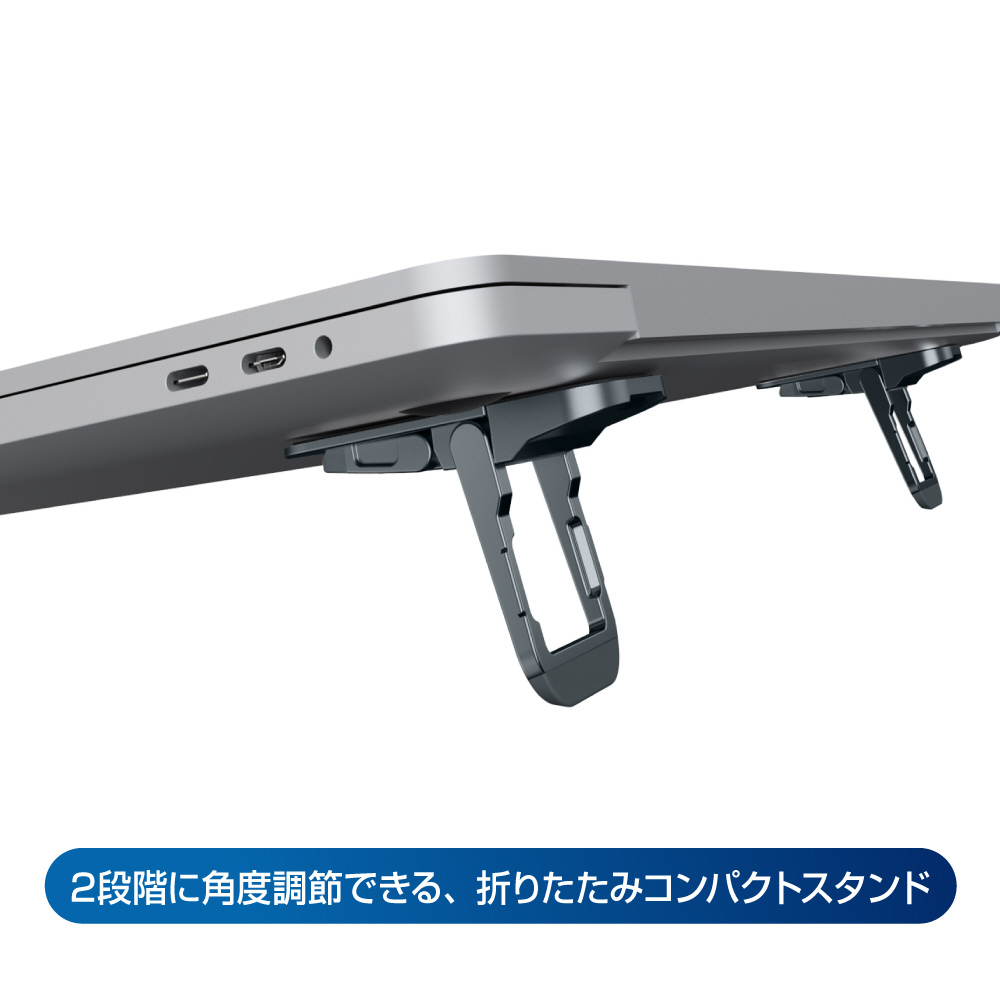 タイピングをしやすく改善!2段階で角度調節できる折りたたみ式ノートPCミニスタンド、目線が上がり、首や肩の負担を軽減し、姿勢を改善することができます。ノートPCの背面を浮かせることができるので、排熱効率UPも期待にもなります。