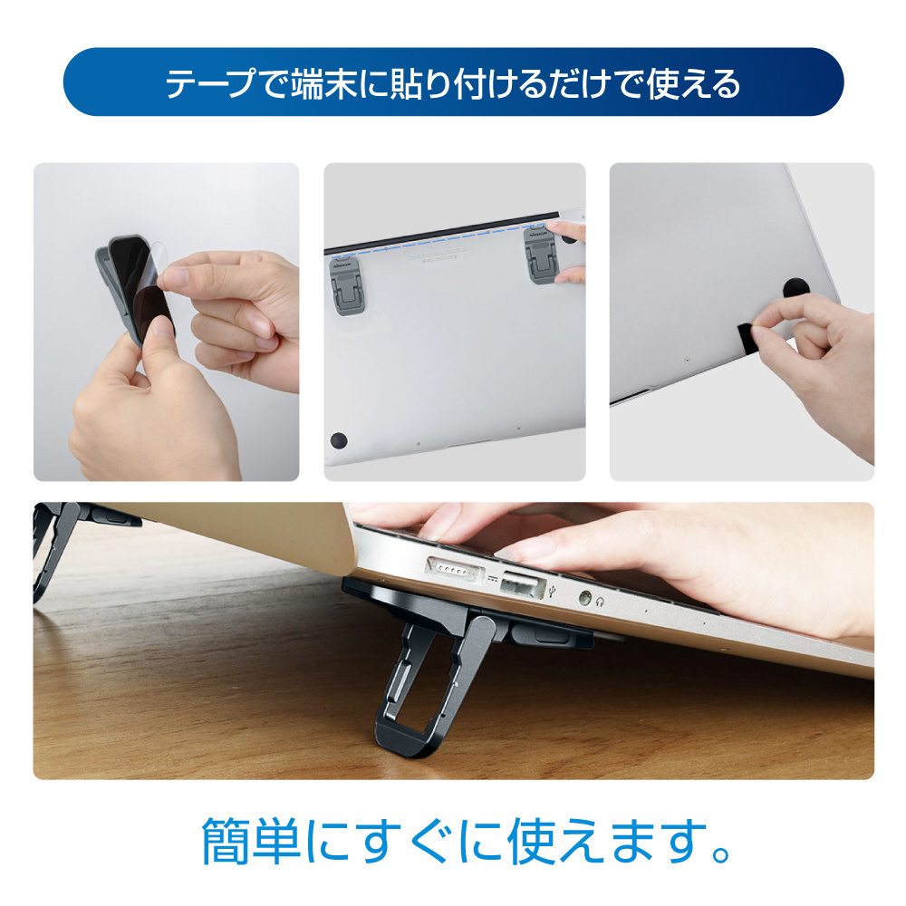 タイピングしやすい角度に調節できるミニスタンド。ノートPCに貼り付けるだけで、簡単に取り付けることができます。