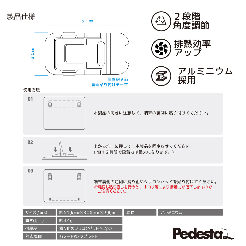 | 仕様1 | [対応機種] 9〜16インチノートパソコン [サイズ(1pcs)]約W61xD30xH9mm [素材]アルミニウム [重さ(1pcs)]約44g [付属品]滑り止めシリコンパッドx2pcs |