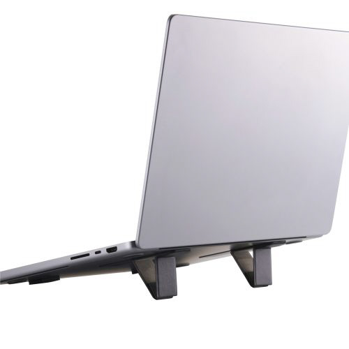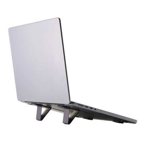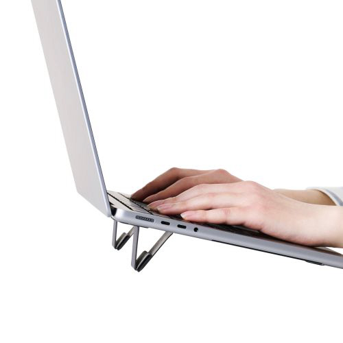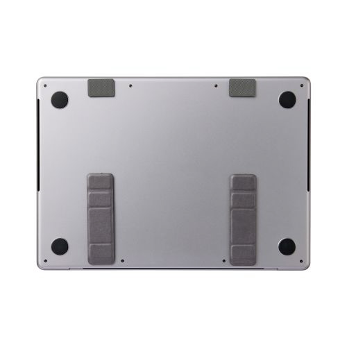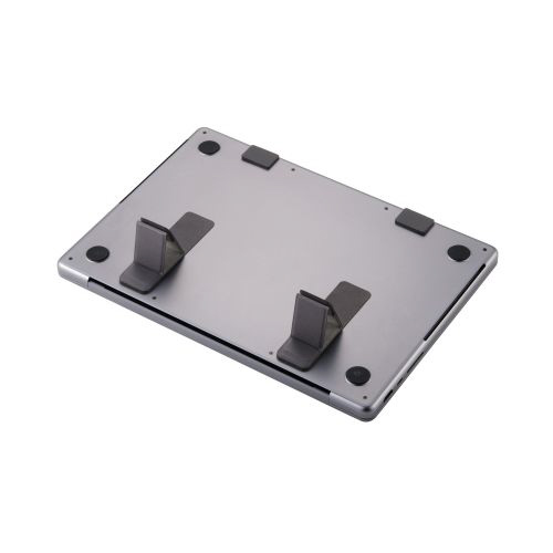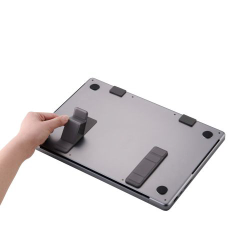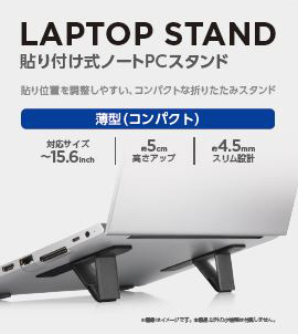 装着したまま持ち運び可能!ノートパソコンの底面に貼り付けて使用する折りたたみ式スタンドです。持ち運びの際に邪魔にならない薄型設計。サイズが小さいため、貼り位置を調節しやすく排熱口を避けて貼り付けられます。