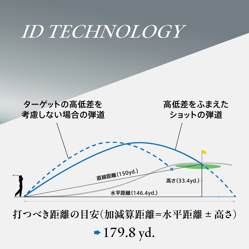 コースの勾配を読み取り、打つべき距離の目安(加減算距離=水平距離±高さ)を表示するID TECHNOLOGY搭載。