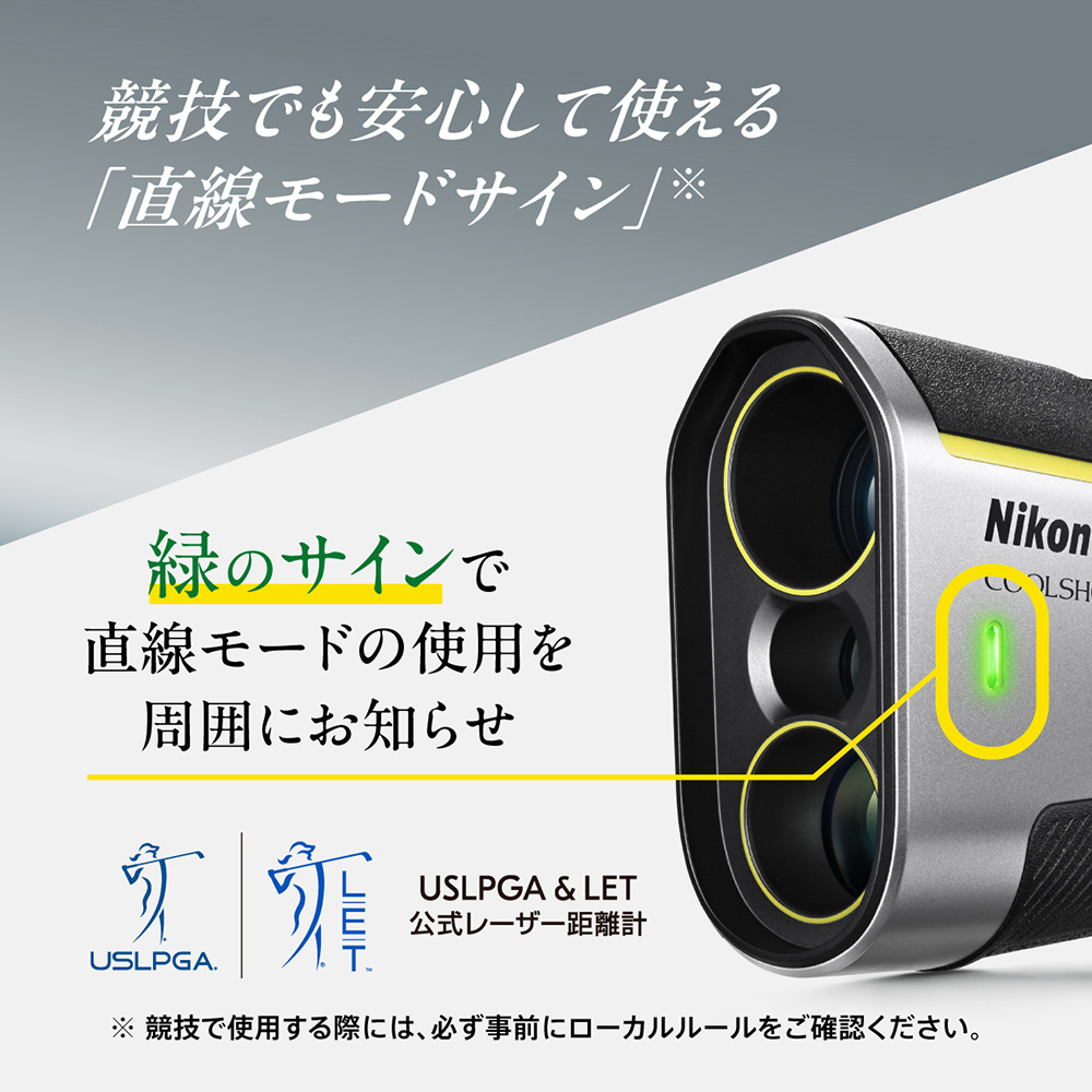 | 測定精度 | ±1 m/yd.(100m/yd.未満)※1 ±2 m/yd.(100m/yd.以上、1000m/yd.未満)※1 ±0.5% m/yd.(1000m/yd.以上)※1 ※1 ニコンビジョンの測定条件による(本製品は簡易距離計のため、測定結果は公的な証明等には使用できません)。 |