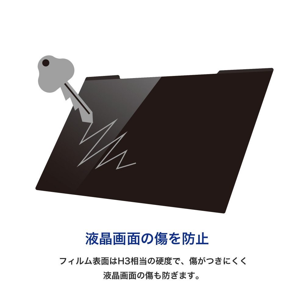 | 仕様1 | [フィルム表面]表面:ノングレア加工、裏面:グレア加工 [視野角度]60°(左右30°) [表面硬度]3H [保証期間]6ヶ月(付属品を除く) |
