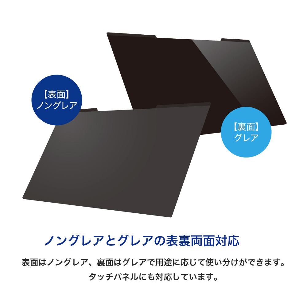 フィルムはノングレアとグレアの表裏両面、2WAY仕様。ノングレアフィルムは指紋防止加工を施しており指紋やホコリなどが付きにくく、また反射防止加工により画面への映り込みを防ぎます。グレアフィルムは鮮明なコントラストが再現でき、それぞれの使用シーンに合わせてお好みでお使いいただけます。