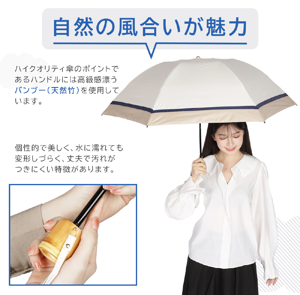 ハイクオリティ傘のポイントであるハンドルには高級感漂うバンブー(天然竹)を使用しております。個性的で美しく、水に濡れても変形しずらい、丈夫で汚れがつきにくい特徴があります。焼き加工を施した味のある素材感は、触れているだけでほっこりとした気持ちに。お洒落な持ち手なので、カジュアルな服装にも、きれい目な服装とも相性抜群。いつでも持ち歩きたくなる気持ちの良い傘に仕上がりました。