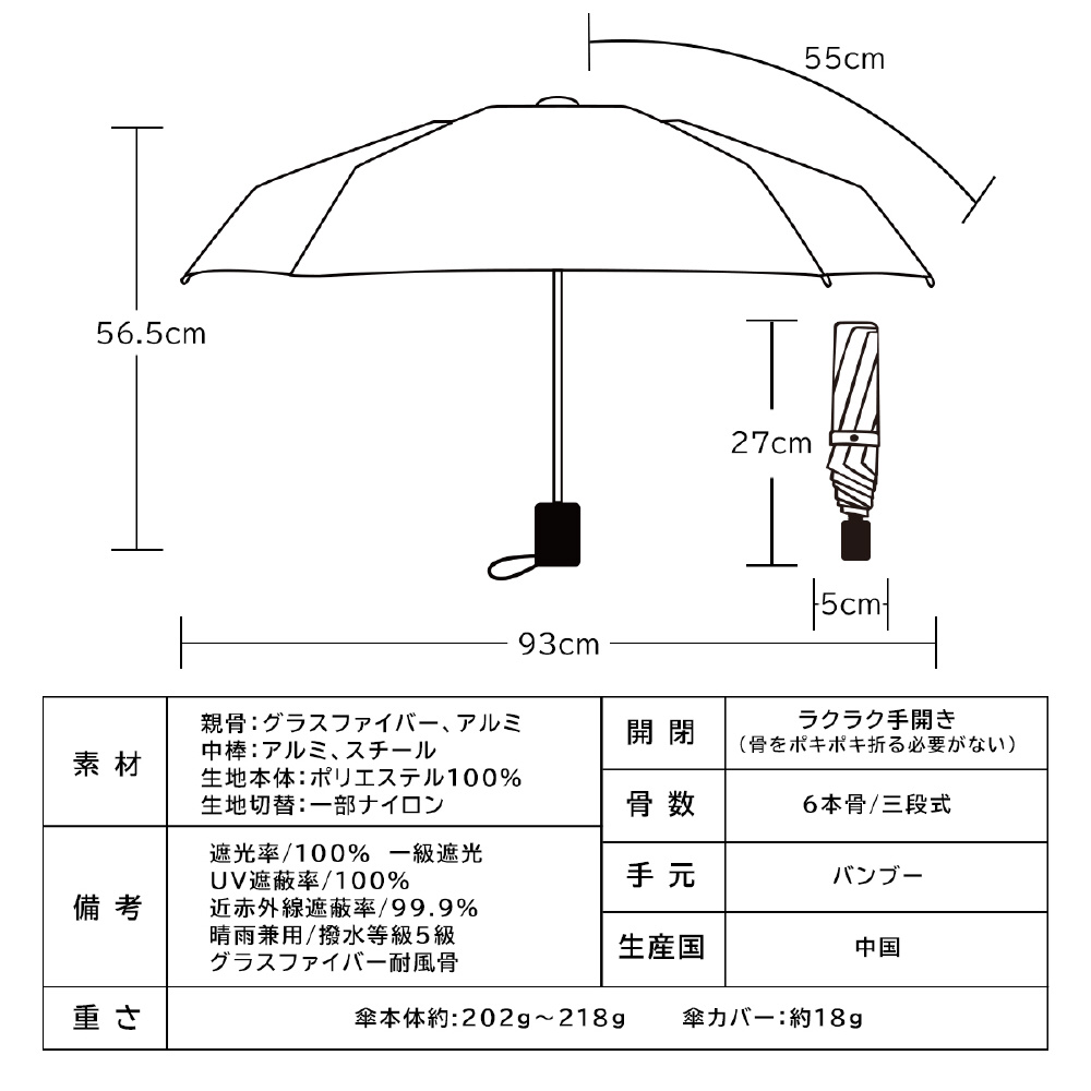 | サイズ | 全長:56.5cm 収納時の長さ:27cm 親骨:55cm 直径:93cm |