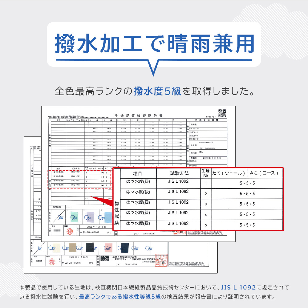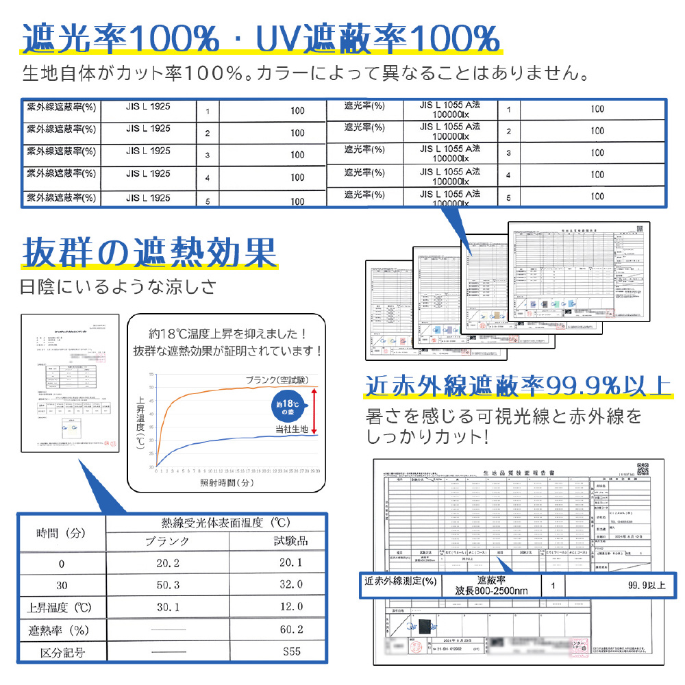 日本繊維製品品質技術センターにおいて、遮光率100%、UVカット率は100%、遮熱効果、撥水5級の最高ランクと証明された生地を採用!