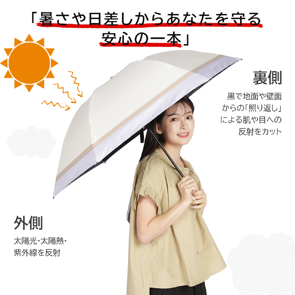 季節問わず使うことができ、梅雨対策にもUV対策には欠かせない優秀なアイテム!上からのUV反射カット、裏側のブラック遮熱コーディングが地面や壁面からの「照り返し」からお肌や目への反射をカットします。木陰にいるような涼しさで出かけも楽しくなります!また、ポリエステル繊維生地のうえ超撥水加工もしており、軽量でありながら優れた撥水性能を持ち、晴雨兼用でご利用いただけます。
