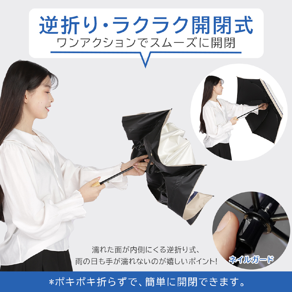 濡れた面が内側にくる逆折り式で、雨の日も体や衣服が濡れにくいのが特徴です。