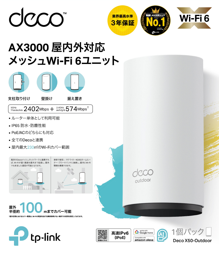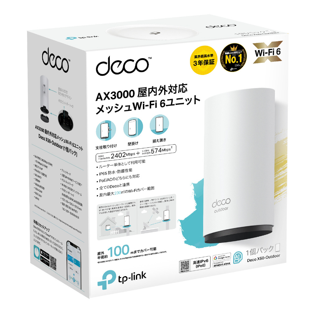 Wi-Fiルーター 574+2402Mbps AX3000(屋内外対応) Deco X50-Outdoor [Wi-Fi 6(ax) /IPv6対応]