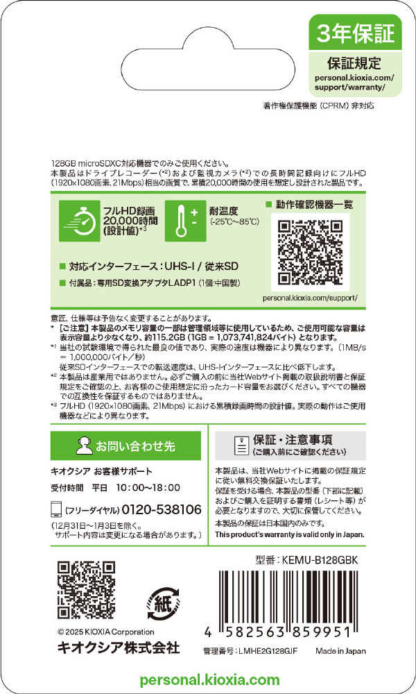【高耐久・繰り返し録画】【ドライブレコーダー・ホームセキュリティカメラにおすすめ】SDXC microSDカード EXCERIA HIGH ENDURANCE G2(エクセリアハイエンデュランスG2) KEMU-B128GBK [Class10 /128GB]