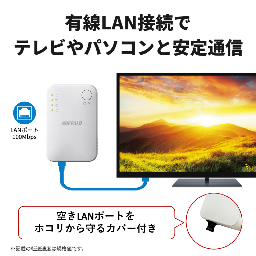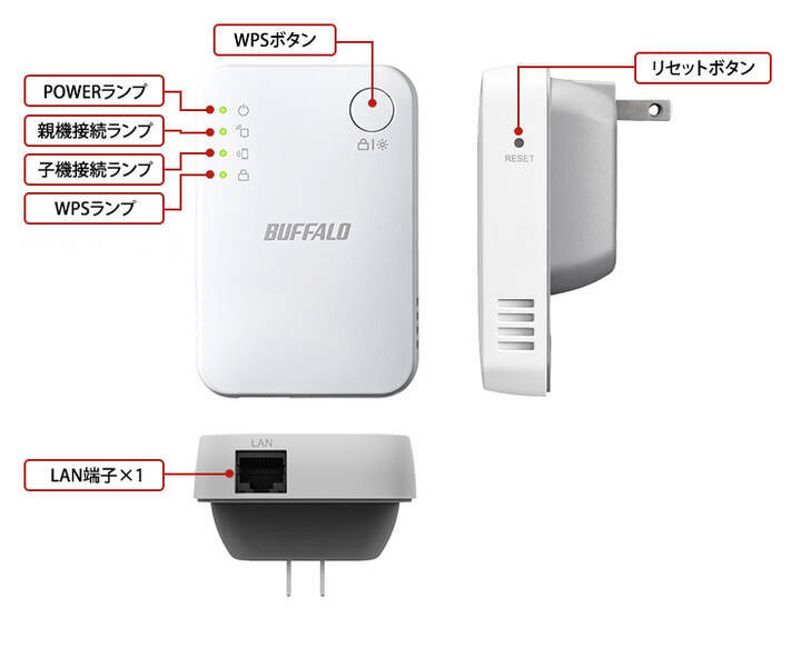 まずは本商品のWPSボタンを約2秒間プッシュ、次に現在お使いのWi-Fiルーター(無線LAN親機)のWPSボタンをプッシュして設定完了。 Wi-Fiルーター(無線LAN親機)の設定を引き継ぐので、今まで使っていたスマホやタブレット、パソコンといったWi-Fi対応機器の設定を変更する必要はありません。 他社製のWi-Fiルーター(無線LAN親機)をお使いの場合も、WPS対応であれば本商品をお使いいただけます。