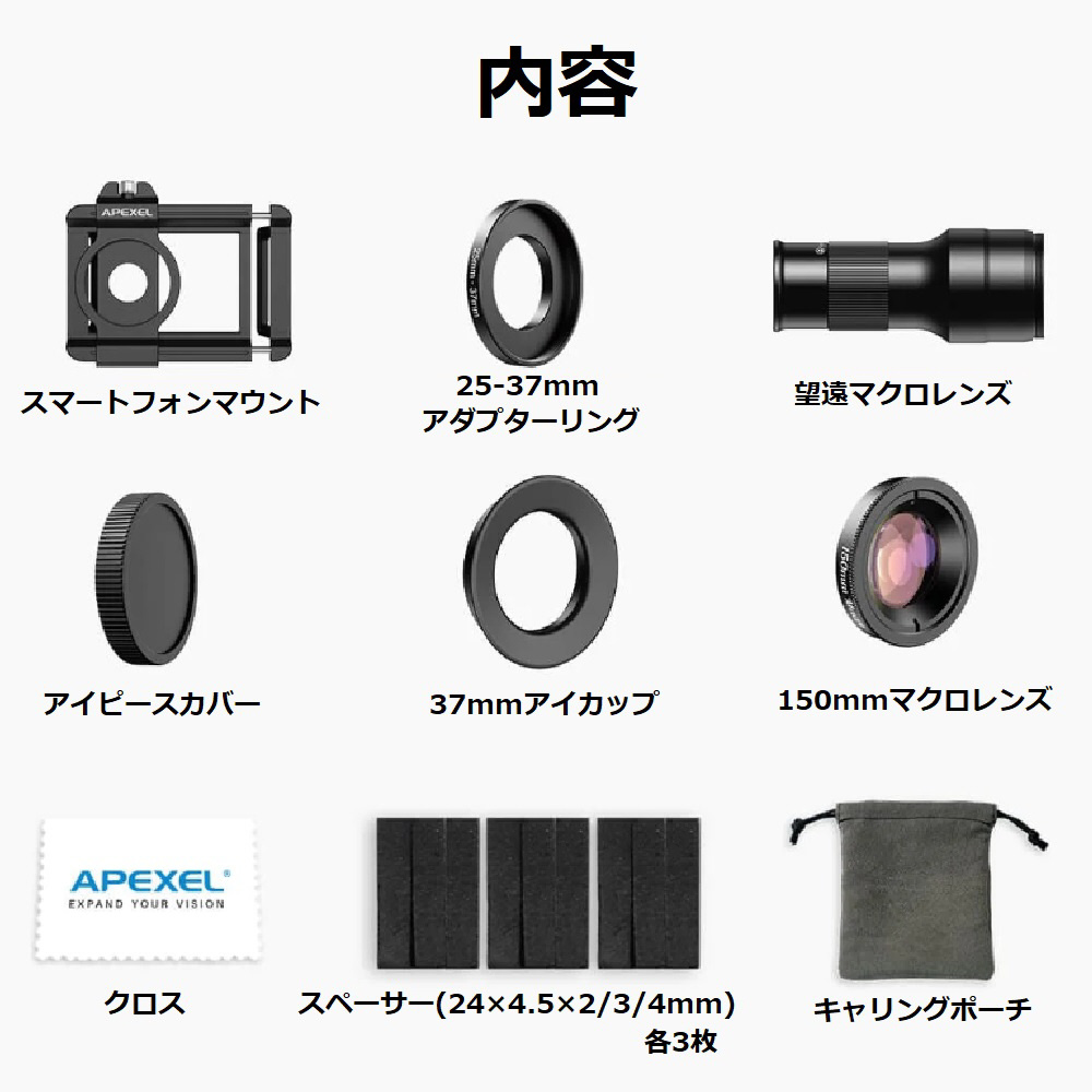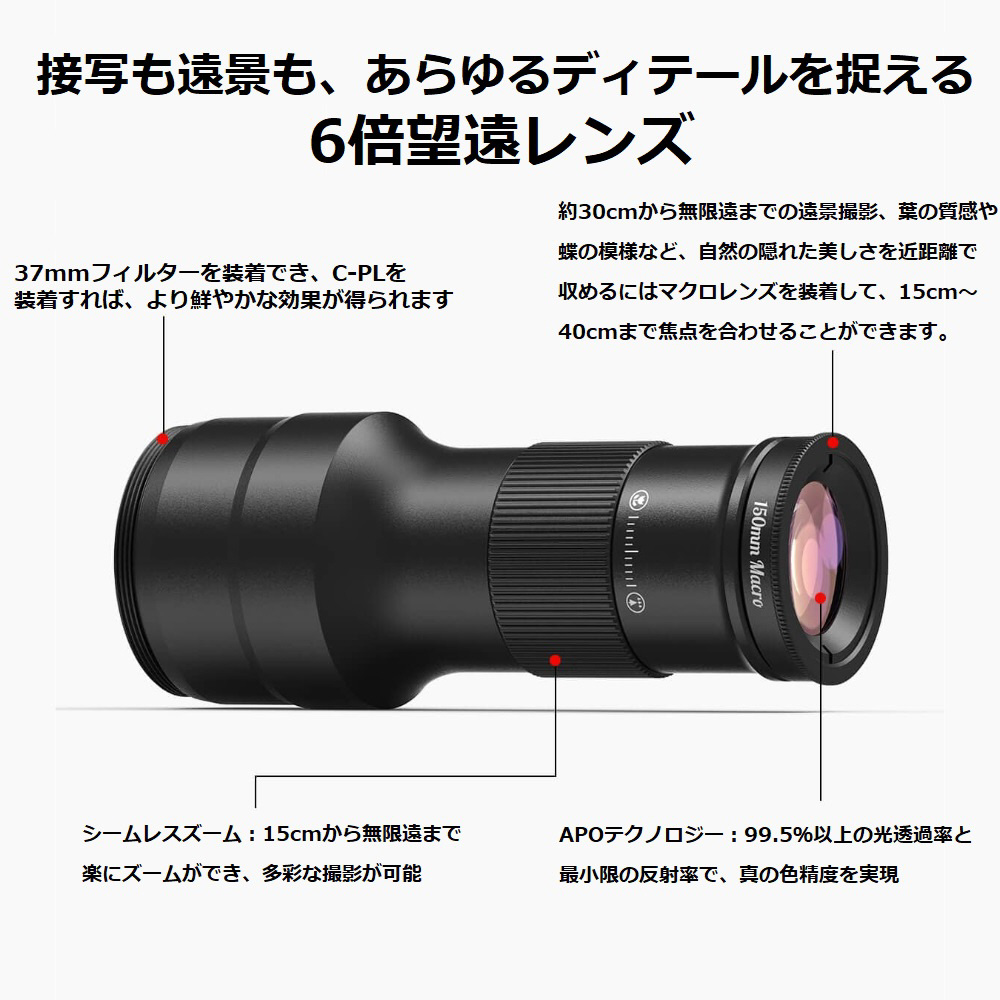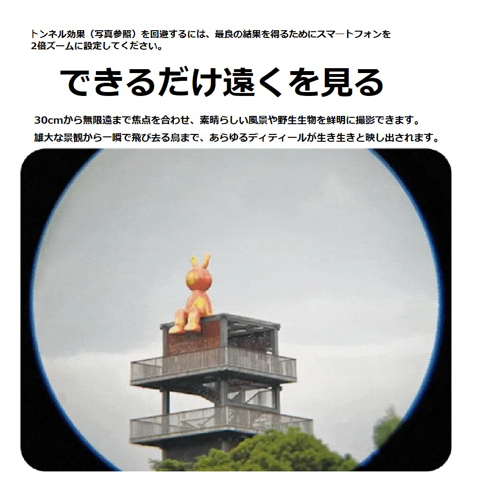 スマートフォンに取り付けることで光学倍率6のマクロ&望遠撮影が可能となるアクセサリです。付属のアイカップを使用することで拡大鏡・単眼鏡としても使用できます