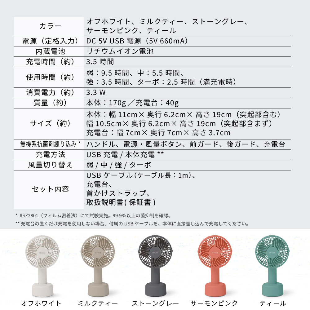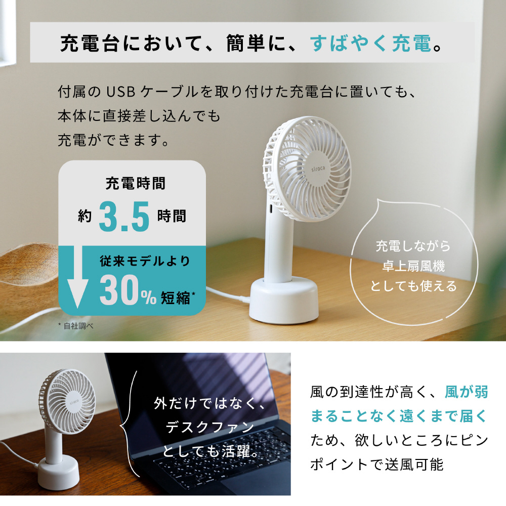 | 仕様2 | 付属の充電台に置けば、卓上扇風機としても使用可能 |