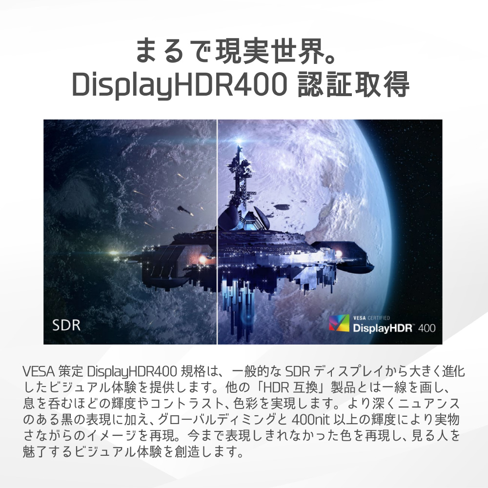 VESA策定DisplayHDR400規格は、一般的なSDRディスプレイから大きく進化したビジュアル体験を提供します。