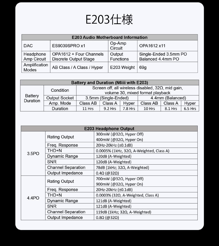 E203に搭載されているDACチップES9039SPROは、最新のHyperstreamR IVアーキテクチャの下で開発されました。