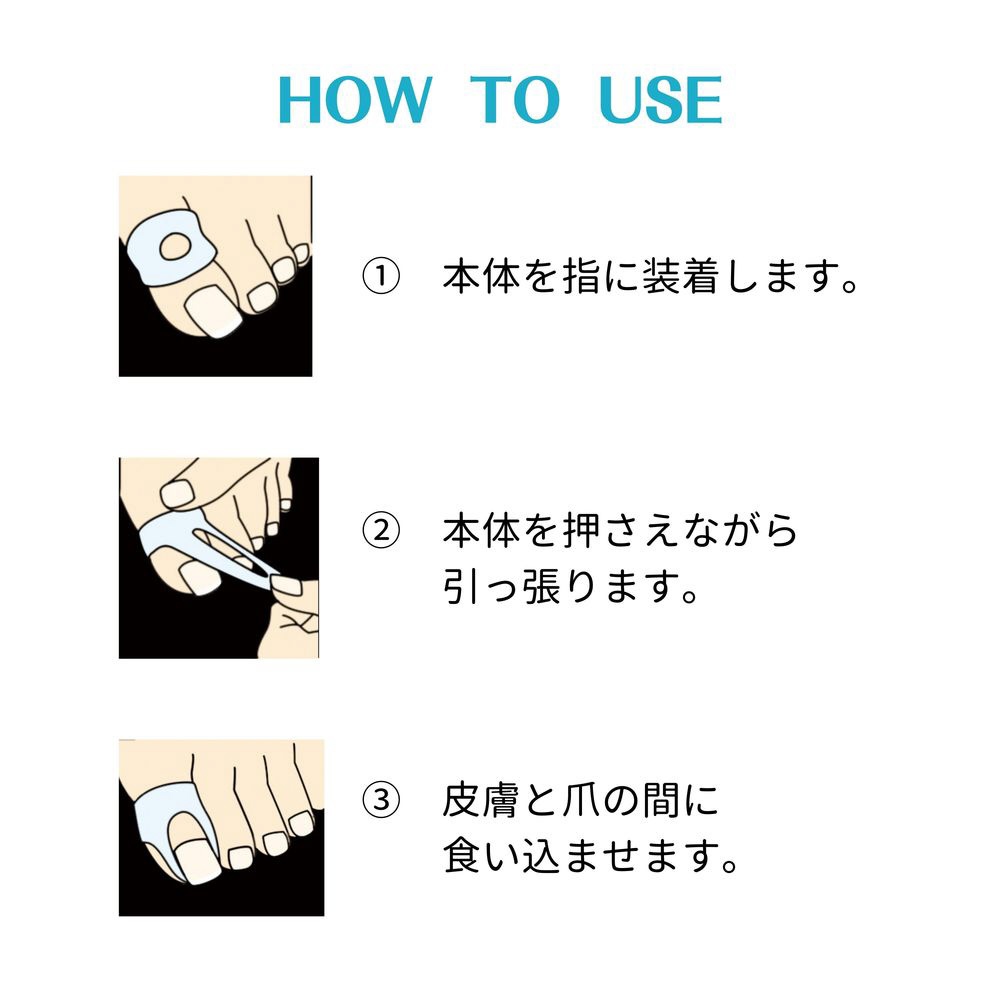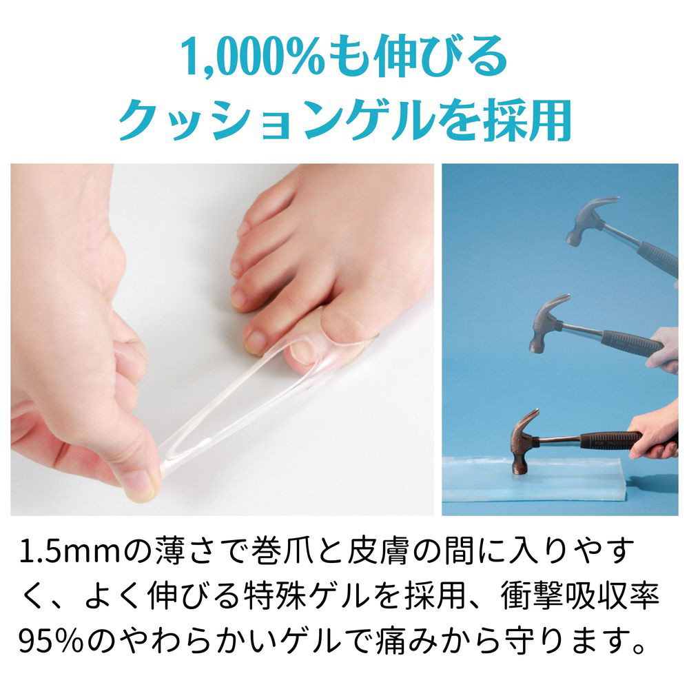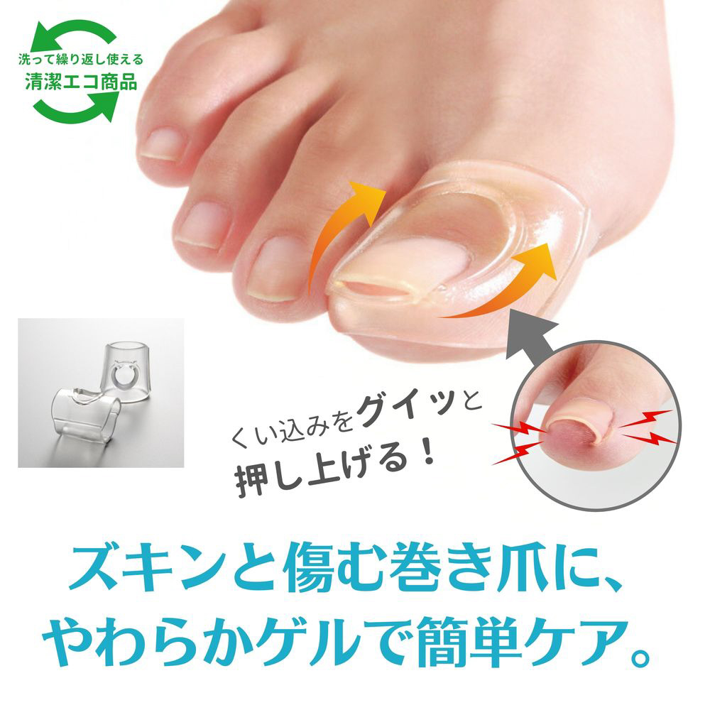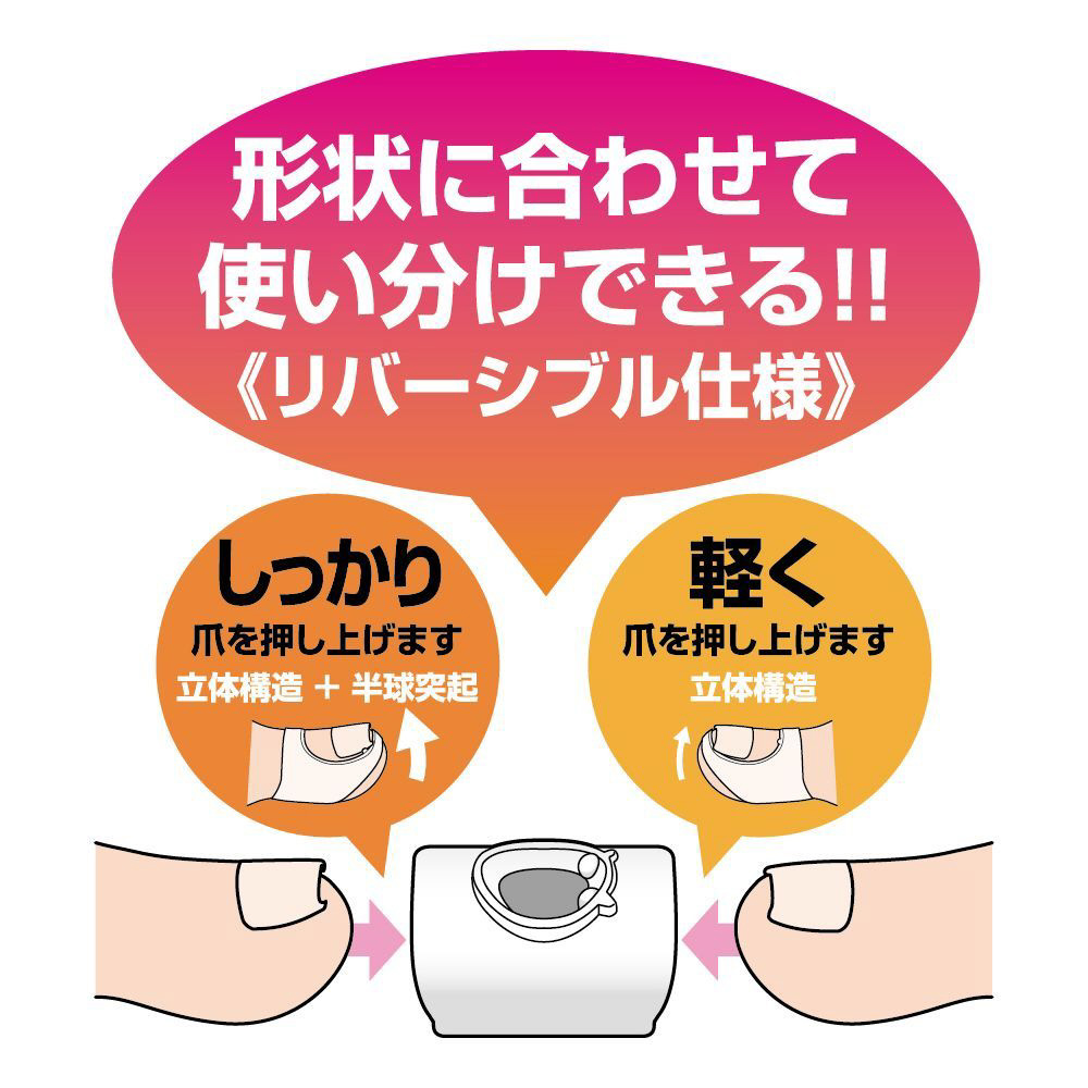 カンタン巻き爪ケア。親指にくい込んだ「巻き爪」の痛みに。「擬似生体ゲル」を使用。親指と皮膚の間に挟み込み、くい込んだ爪をグイッと押し上げます。耳たぶのように柔らかく、つけたまま靴を履くことができます。【人肌に近いやわらかゲルを挟み込んでグイッと持ち上げサポート】動いても密着してズレにくい特殊ゲルを使用しています。[ポイント1]痛みに合わせて使い分けできるリバーシブル仕様・しっかり爪を押し上げます【立体構造+半球突起】・軽く爪を押し上げます。【立体構造】突起がある方はしっかりと押し上げ、突起が無い方は軽く上に押し上げるので、その日の痛みに合わせて、方向転換し使い分けて下さい。[ポイント2]こだわりのアール形状アール形状にすることで、指の曲げ伸ばしを妨げない快適な付け心地です。【水洗いOK】水洗いができ、繰り返し使えます。※本品が外れないようにつま先が少し伸びた状態で装着してください。【仕様】2個入り