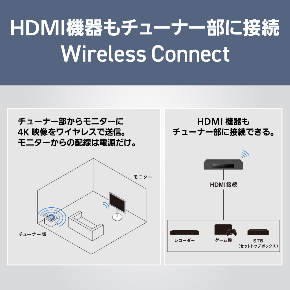 チューナー部からモニターに、4K映像を無線伝送。モニターとチューナー部の無線接続で、配線を気にせず好きな場所で楽しめます。キャスター付きスタンドでかんたんに移動できます。