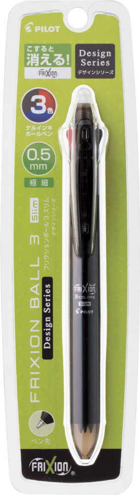 「フリクションボール3 スリム」は何度でも書き消し可能な利便性の高い3色ボールペンです。インキ色は黒・赤・青のベーシック な3色。ペン先は0.38mmの超極細と0.5mmの極細タイプの2種類。手帳や資料などの細かい箇所への書き込みに適しています。またクリップは当社オリジナルのリフトクリップを採用。厚いものでもしっかり挟め、10万回はさんでもこわれません(パイロットコーポレーション社試験データによる)。