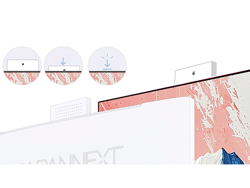 ■モニター上部にポップアップ式のWebカメラとマイクを搭載。テレワークやオンライン授業、ご家族とのビデオ通話など、様々なシーンで活躍します。USB-Cケーブル一本で使用できるため、デスク周りもすっきりと美しく保てます。使わないときはカメラを本体に収納できるスマート設計です。