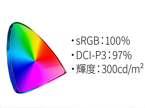 ■あらゆる角度から見ても色やコントラストの変化がおきにくいIPSパネルを搭載し、広視野角上下左右178°を実現します。最大輝度300cd/m2の液晶パネルは、sRGB:100%、DCI-P3:97%の広色域に対応し、動画や写真も色鮮やかに美しく表示します。