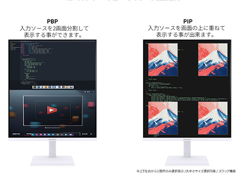 ■複数の入力を同時に表示できる「PBP(Picture by Picture)」モードに対応。最大2つの入力映像を、上下に並べて同時表示できます。特に上下表示では、WQHD(2560×1440)解像度2枚分の画面領域を活用可能。自然な視線移動で、長時間の快適な作業をサポートします。また、一方の入力を子画面として表示する「PIP(Picture in Picture)」モードにも対応し、快適なマルチタスク環境を実現します。