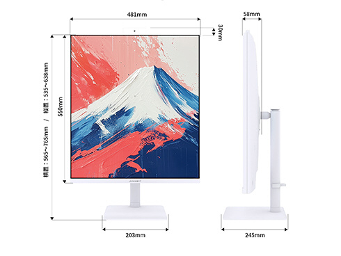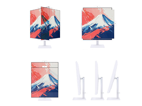 ■高さ調整が可能な昇降式多機能スタンドを搭載、100mmの範囲(横置時)で最適な高さに画面を調整可能です。また、90°回転によるピボットにも対応しています。スイーベル(首振り)機能は、左右各45°の範囲で動かせます。