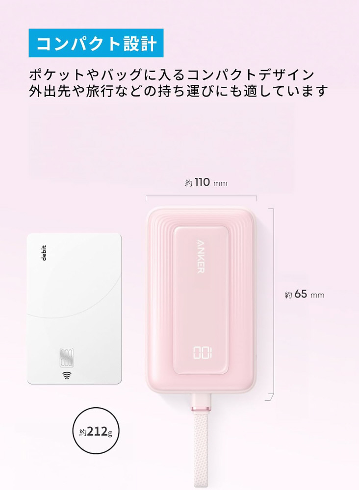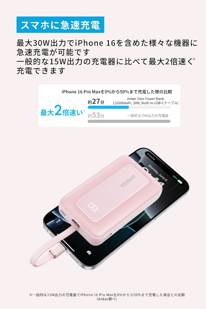 モバイルバッテリー Zolo Power Bank (10000mAh、30W、Built-In USB-Cケーブル) ピンク A1688052 [USB Power Delivery対応]