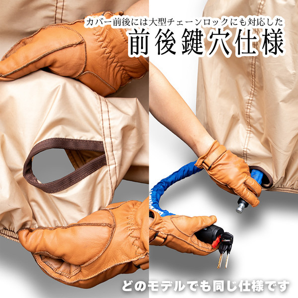 カバー前後の設けた大型ワイヤーロック対応の鍵穴・風飛び防止用のセンターベルト・ハンドル部に設けたエアベンチレーター