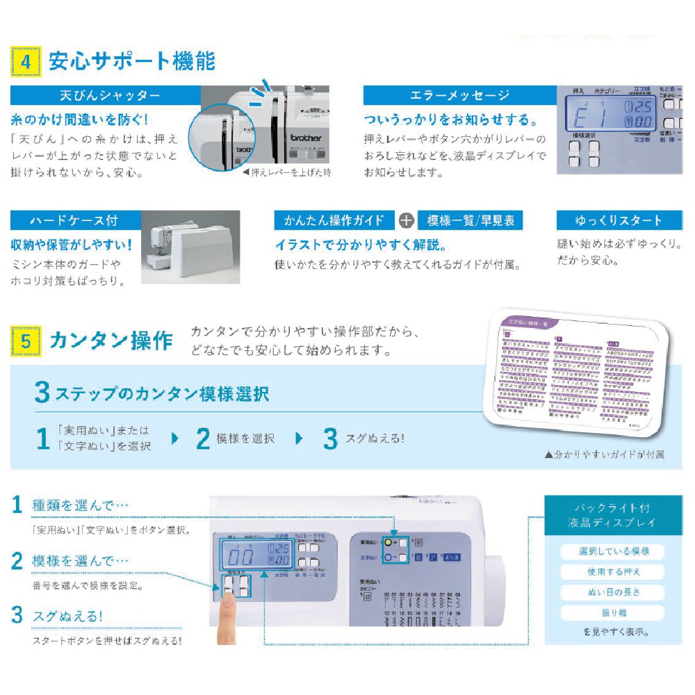 | 付属品 | ジグザグ押え(本体に装着)・ボタン穴かがり押え・たち目かがり押え・片押え・まつりぬい押え・模様ぬい押え・リッパー・付属品バッグ・ハードケース・フットコントローラー・取扱説明書・かんたん操作ガイド・模様一覧/早見表・ボビン・ネジ回し・ドライバー・ミシンブラシ・糸こま押さえ(大)(中)・針・電源コード |