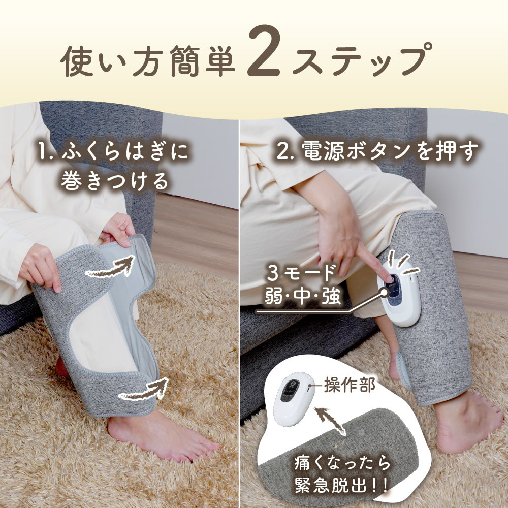 「エアぎゅっと」の使い方はとても簡単!ふくらはぎに巻きつけて電源ボタンを押すだけです。