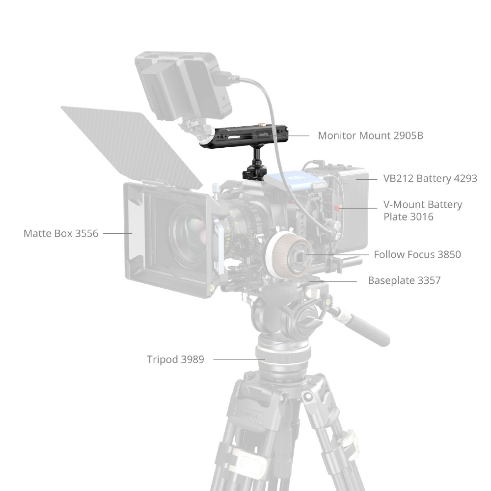 細長いハンドル (162mm / 6.3 インチ) にはシリコン パッドが内蔵されており、大きな手を持つユーザーでも快適かつしっかりと握ることができます。複数の取り付けインターフェイスにより汎用性が向上し、モニター マウント用の 3/8 インチ - 16 ARRI 位置決め穴 (ID 2093B)、リモート コントローラー (ID 3902) やマジック アーム (ID 3873) などのアクセサリを取り付けるための 1/4 インチ - 20 ネジ穴と位置決め穴、モニター マウント用のコールド シュー マウント (ID 2905B)、マイク (ID 3487)、ビデオ ライト (ID 3286B) などがあります。