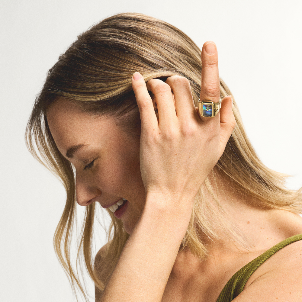 タイムレスなレクタングル形のタイムピースは、光をとらえて美しく輝く光沢のあるアバロン(アワビ)のシェルダイヤルが特徴です。