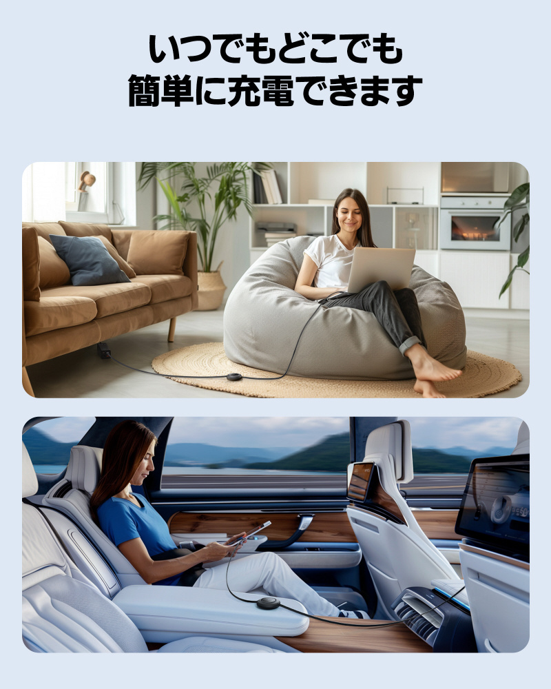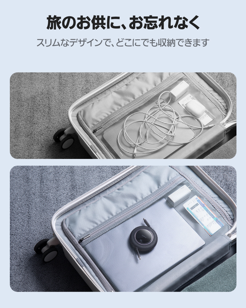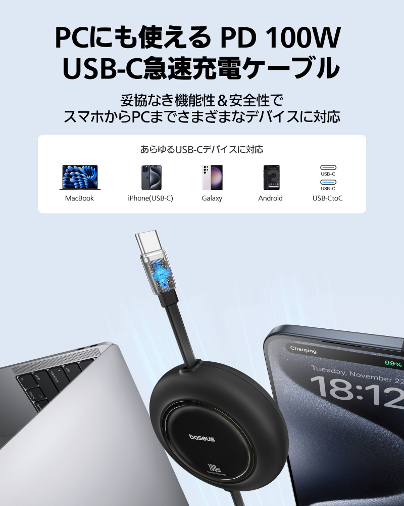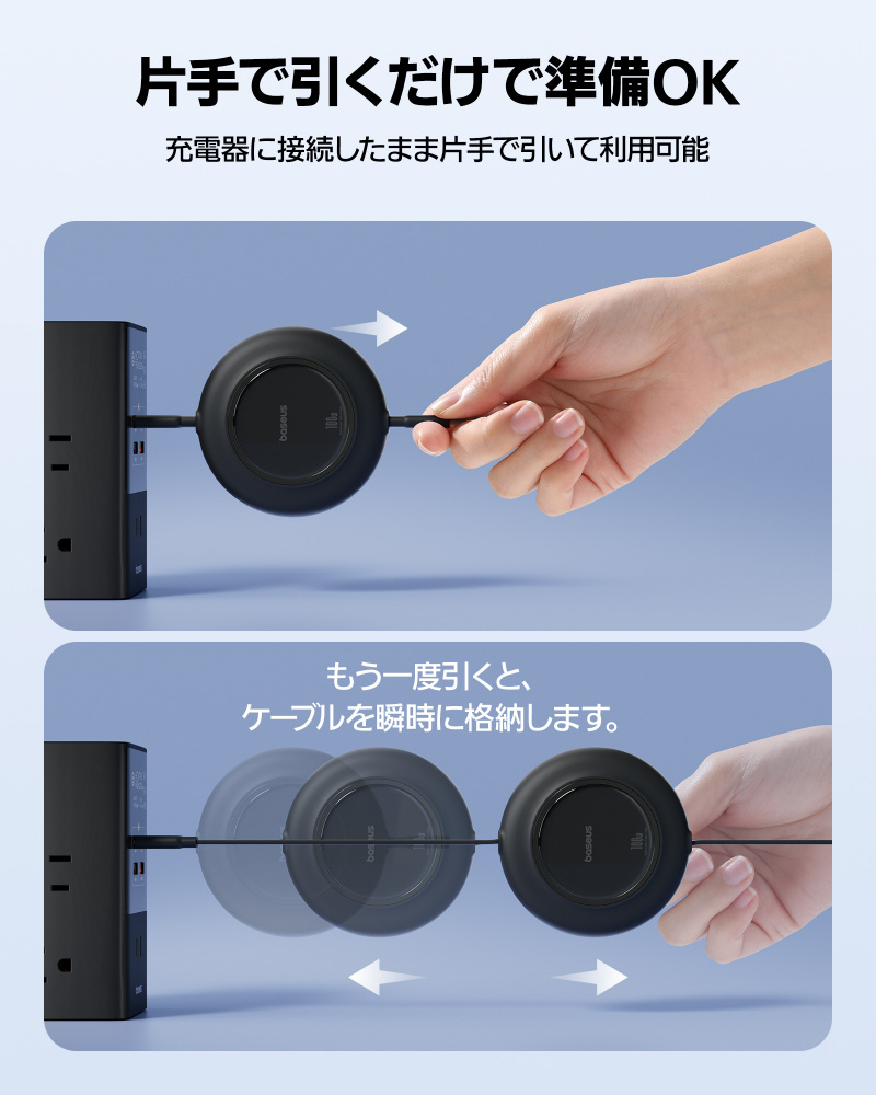 特許取得済み独自の巻取構造を採用したUSBケーブル片側だけひっぱり伸縮が可能長さ2m薄型で洗練されたデザイン7 ステップの長さで固定100W最大480Mbpsのデータ転送に対応