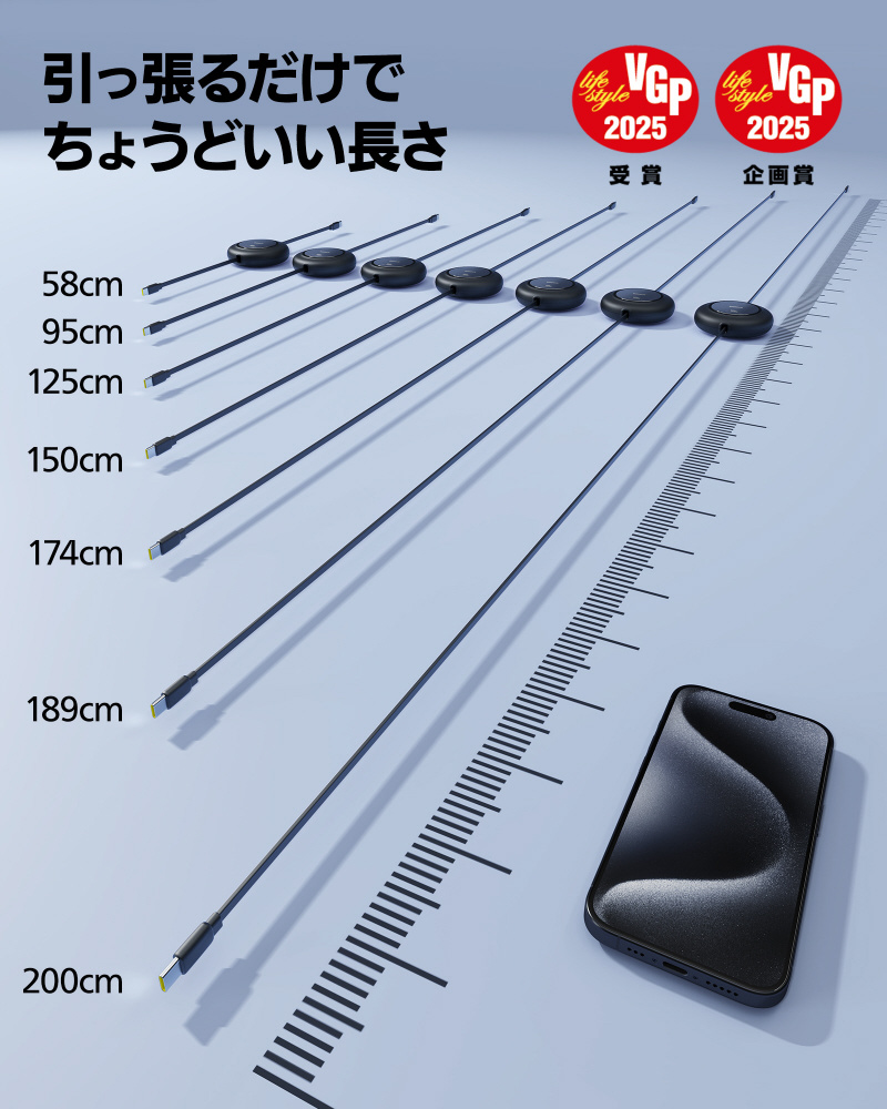 巻き取り式ケーブルの新しいスタンダード。片側を引っ張るだけで伸縮可能な独自設計機構を採用。2mに対応。