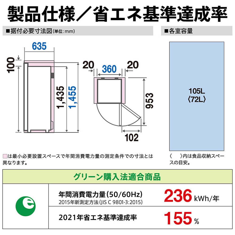 | 年間消費電力量 | 236kWh/年(JIS C 9801-3:2015) |