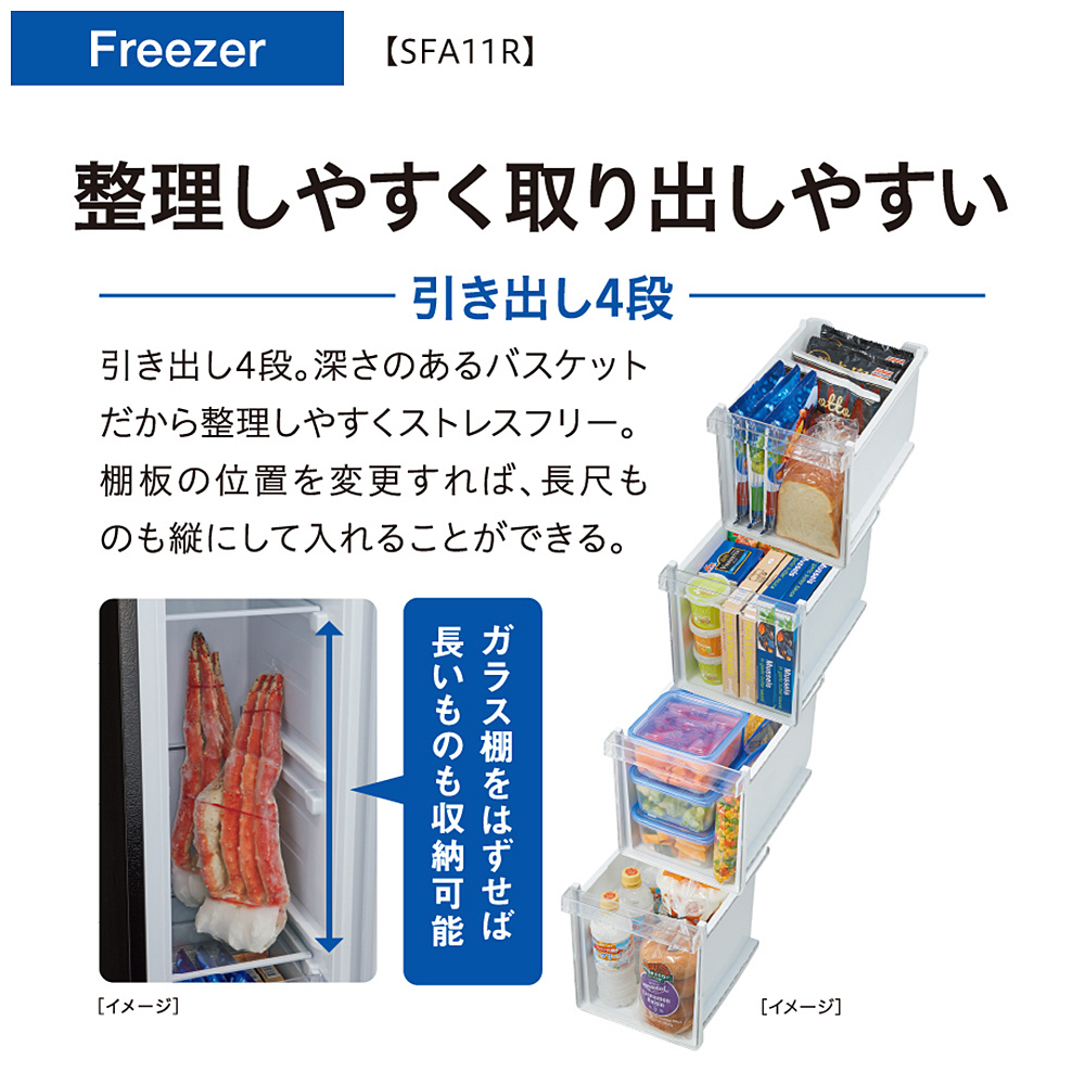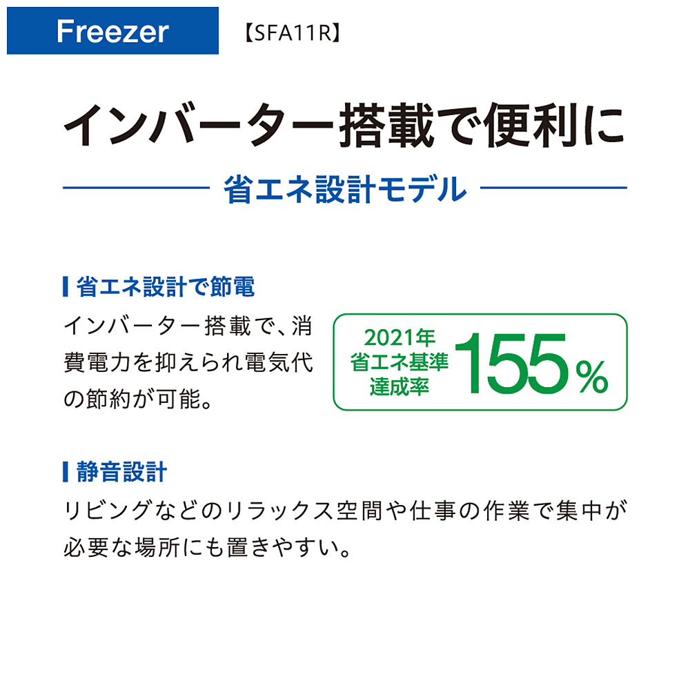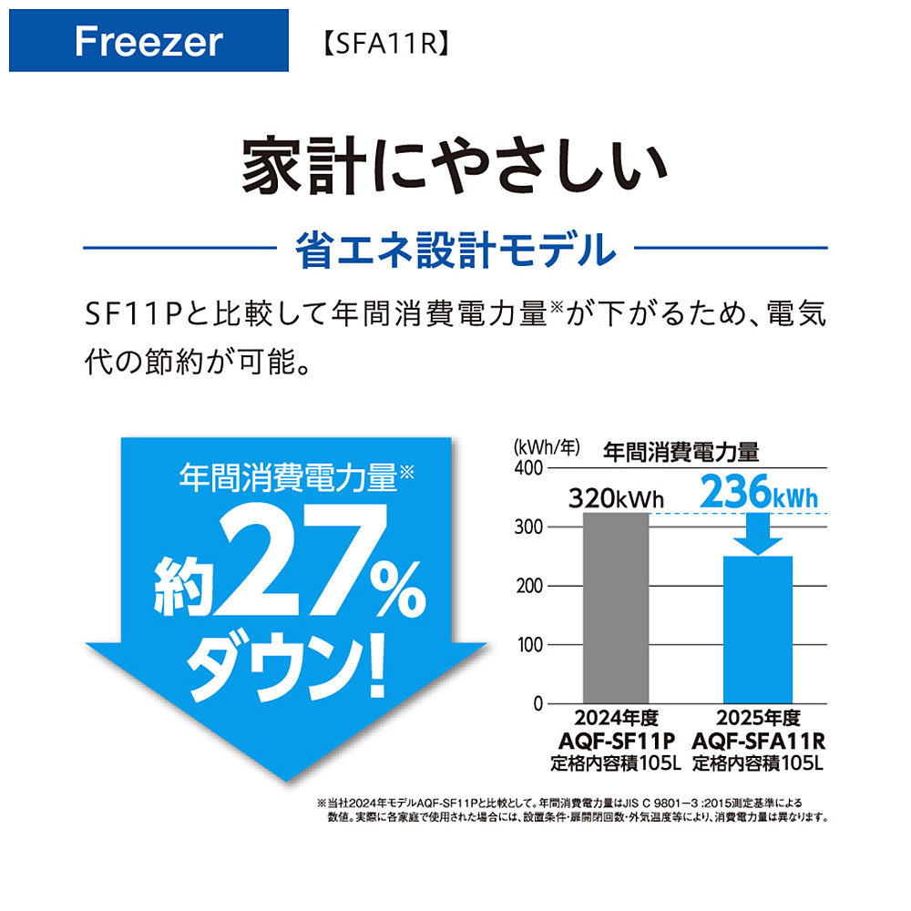 | 商品名 | ファン式冷凍庫 シルバー AQF-SFA11R-S [幅36cm /105L /1ドア /右開きタイプ /2025年] |