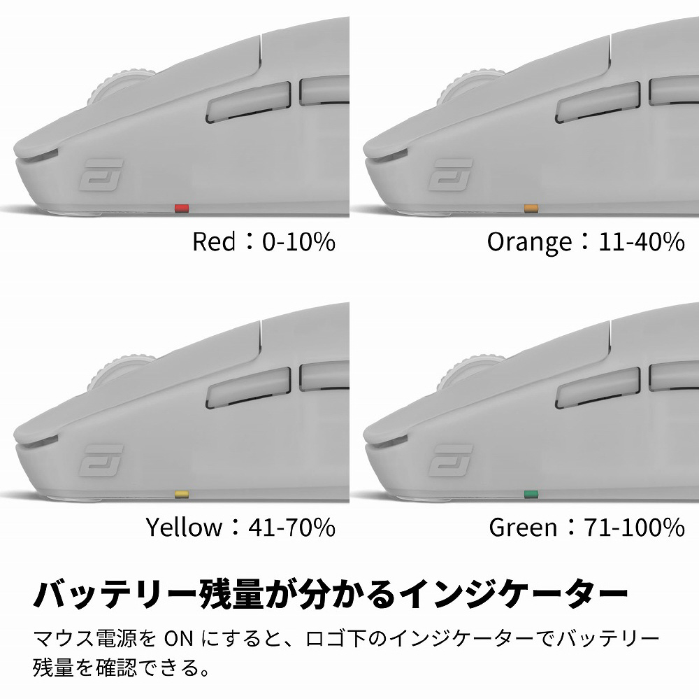 | 仕様2 | [センサー]Pixart PAW 3395 光学式 [ポーリングレート]1000 / 2000 / 4000 Hz(デフォルト) [リフトオフディスタンス]1mm(デフォルト)または 2mm [最大加速度]50G [最大認識速度]650 IPS [マイクロコントローラー]Nordic nRF52840(マウス)/ Nordic nRF52820(ドングル) [ホイールエンコーダー]TTC シルバー(ワイド) [クリック検出]デジタル [オンボードメモリ]対応 |