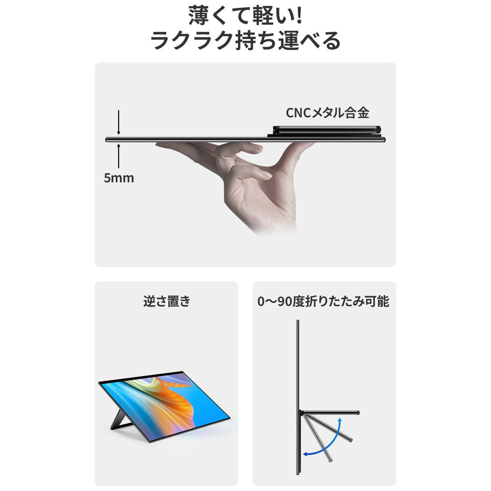 最薄部は5mmで、まるでノートを持ち歩く感覚でどこへでもご携帯いただけます。作業場所では場所を選ばず、付属のケーブル一本でデバイスと接続可能です。※デバイスによって電源供給が別途必要となります。バッグに入れたり、手持ちでも。ビジネスオフィス/カフェ/旅行先にも簡単に持ち運べ、あらゆるシーンで快適に使用できます。皆様の理想のライフスタイル実現の一助となること間違いありません。ボディー素材には高品質かつ丈夫なCNCメタルを使用。